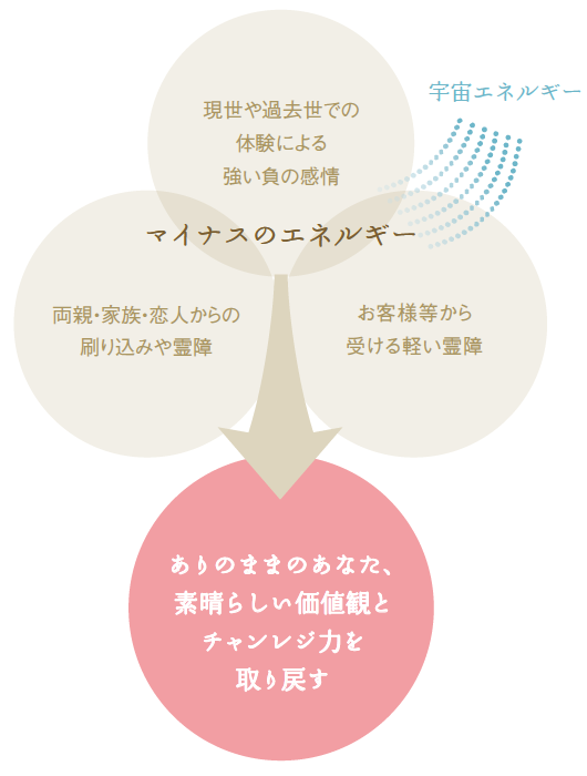 このような悩みをお持ちの方に対し、スピリチュアルな手法を使って幸せを引き寄せます。